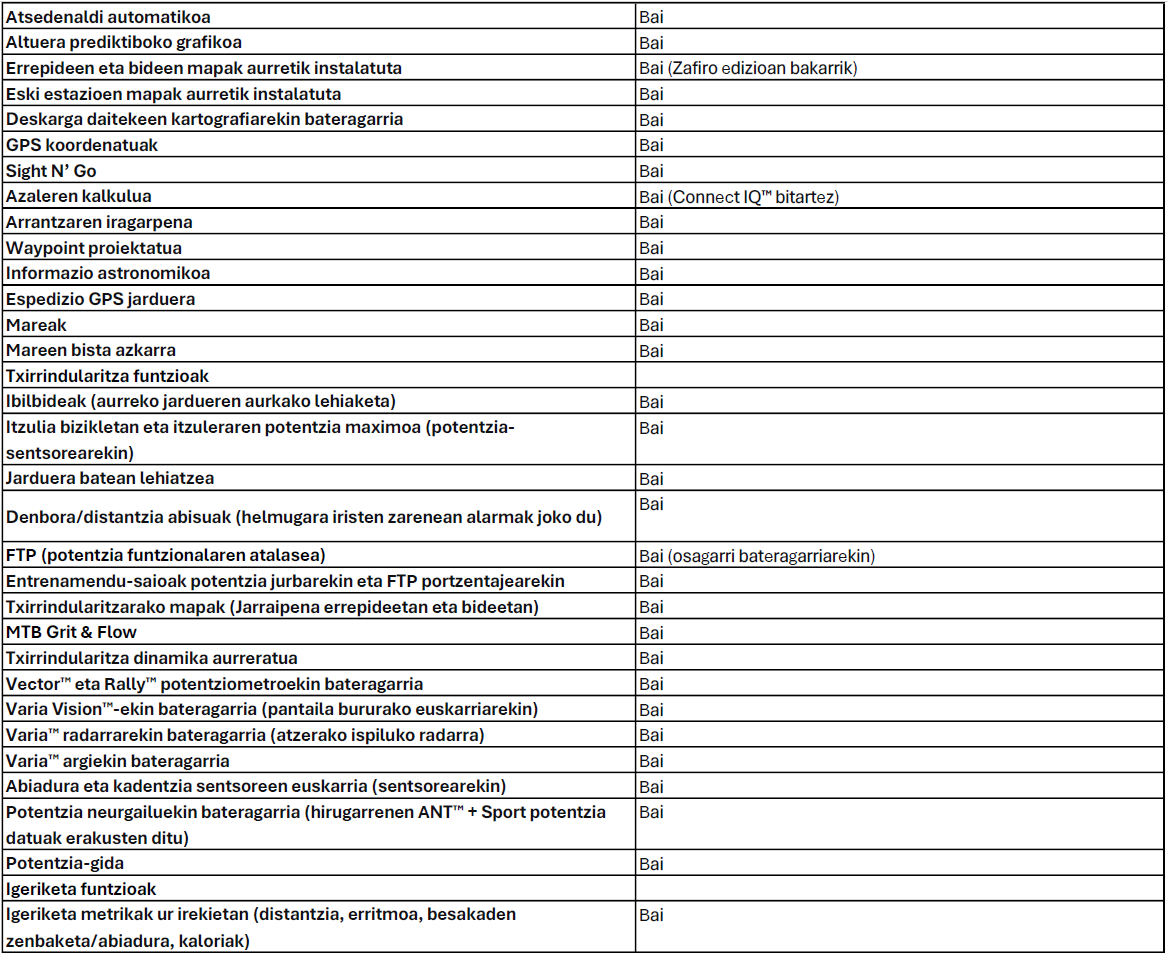 1. Telefono bateragarri batekin lotzean. 2. Jarduera-monitorearen zehaztasuna. 3. TopoActive mapak aldez aurretik instalatuta datoz Fēnix 8 Zafiro modeloetan 4. Hau ez da gailu mediko bat, eta, beraz, ez da diseinatu inolako gaixotasun medikoen diagnostiko edo jarraipenerako erabiltzeko; ikus honako webgunea: Garmin.com/VoiceFunctionality. Pultsoximetria funtzioa ez dago eskuragarri herrialde guztietan. 5. Beharrezkoa da mezuen igorleak eta hartzaileak Garmin Messenger aplikazioa instalatuta izatea lotutako smartphoneetan 6. Smartphone bateragarri batekin lotzean. Jarraipen eta segurtasun funtzioen mugak eta baldintzak kontsultatzeko, ikus honako webgunea: Garmin.com/safety. 7. Smartphone bateragarri batekin lotzean. Garmin Stocks Tracker aplikazioan emandako datu guztiak informazioa emateko baino ez dira eskaintzen, eta ez dute merkataritza- edo inbertsio-xederik. Kontsultatu Twelvedata.com/stocks webgunea Stocks aplikazioak estalitako balore-burtsei buruzko informazioa lortzeko.