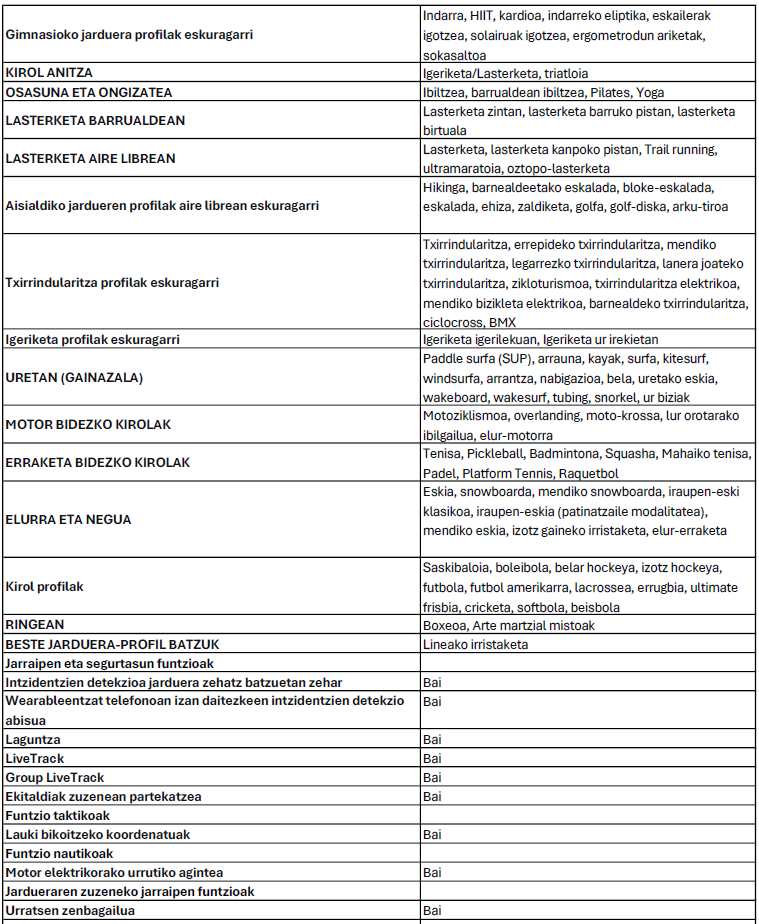 Erabil itzazu aurretik instalatutako jarduera-profilak zure egungo helburuen inguruan datuak eta informazioa lortzeko. Taldeko kirol jardueren jarraipena ere egin ahal izango duzu, futbolarena, futbol amerikarrarena, erraketa bidezko kirolena eta askoz ere gehiagorena.